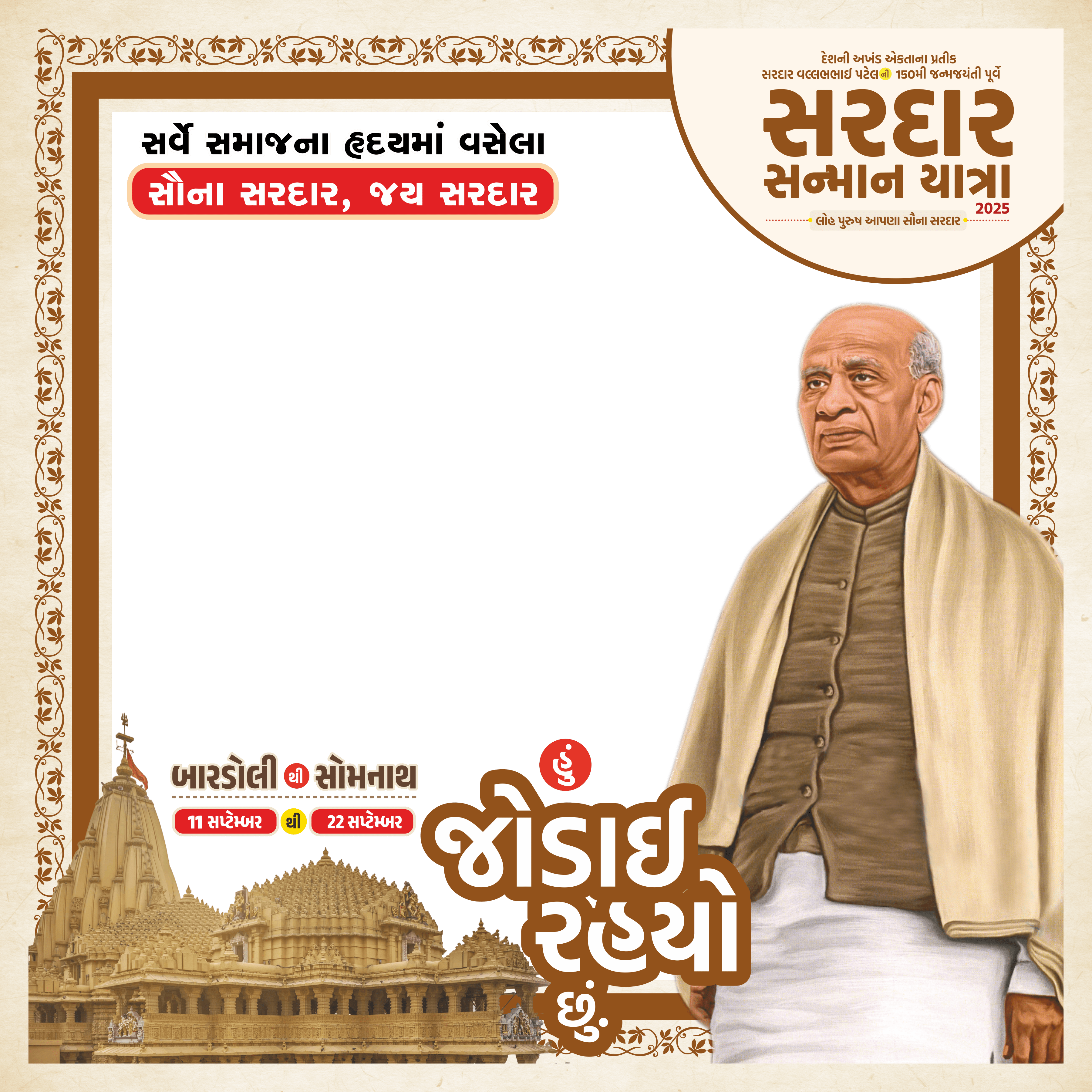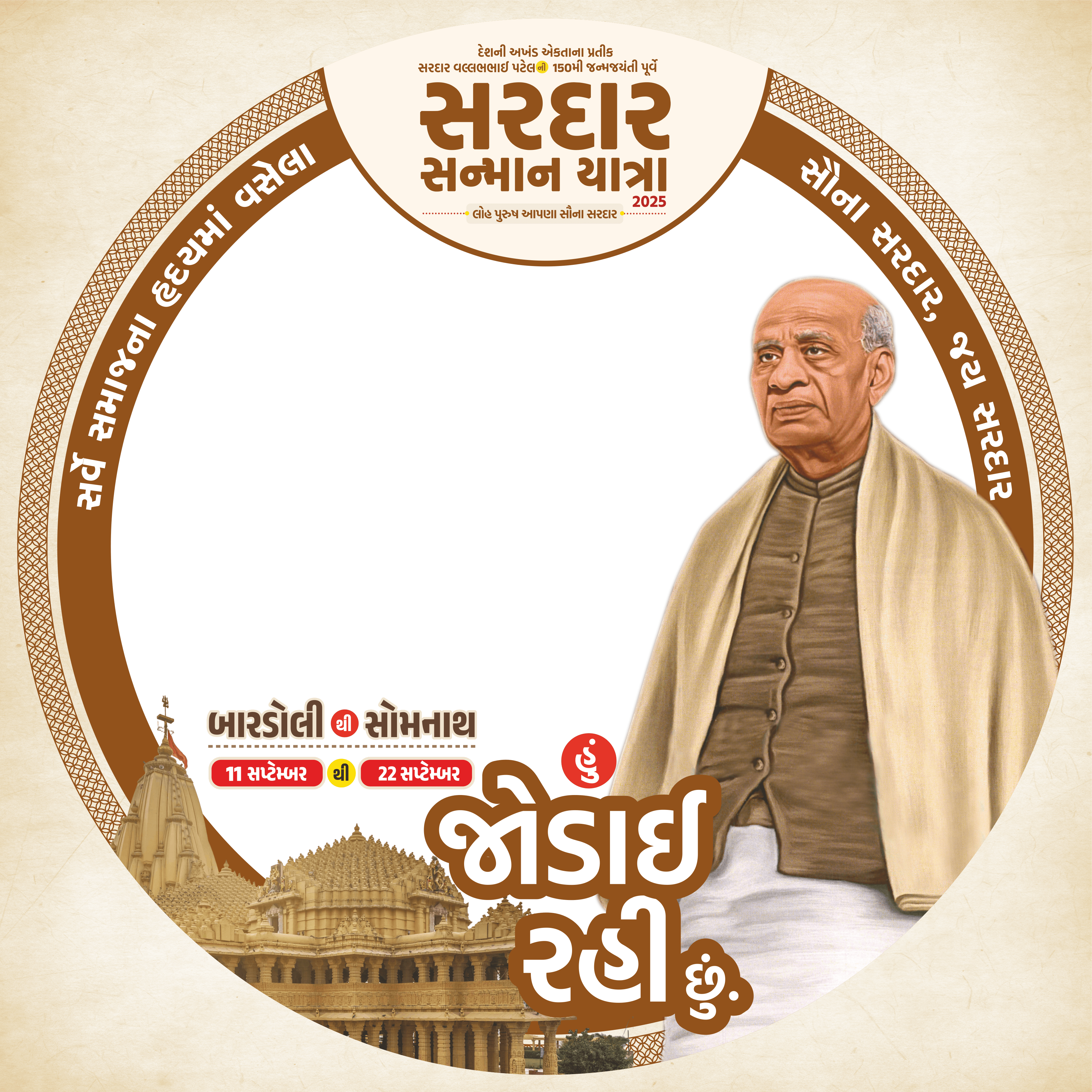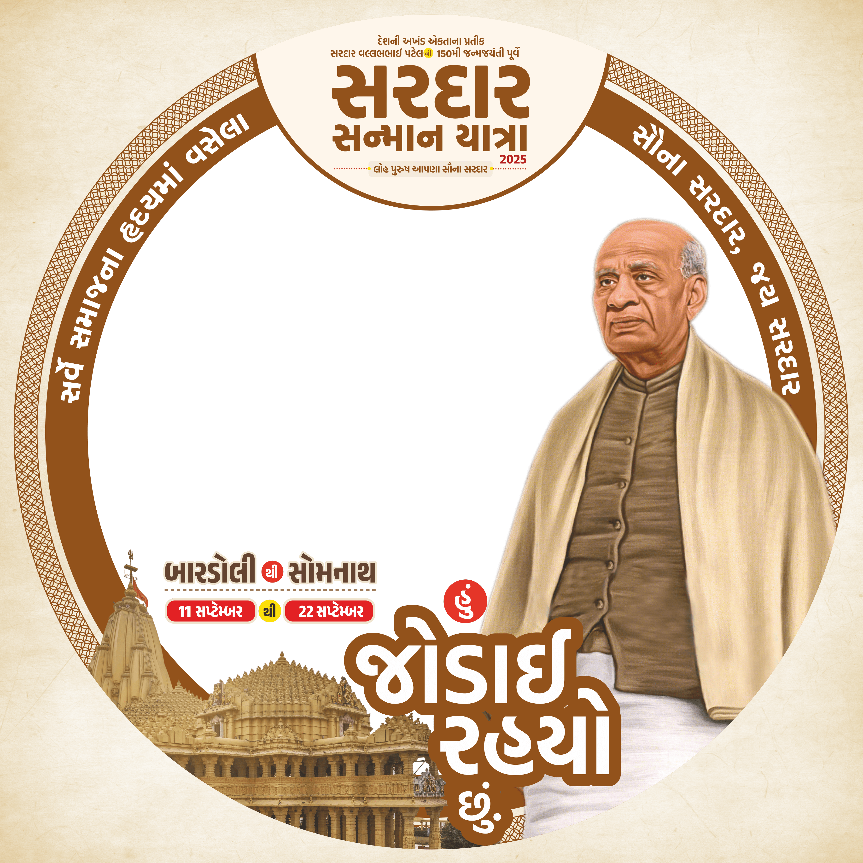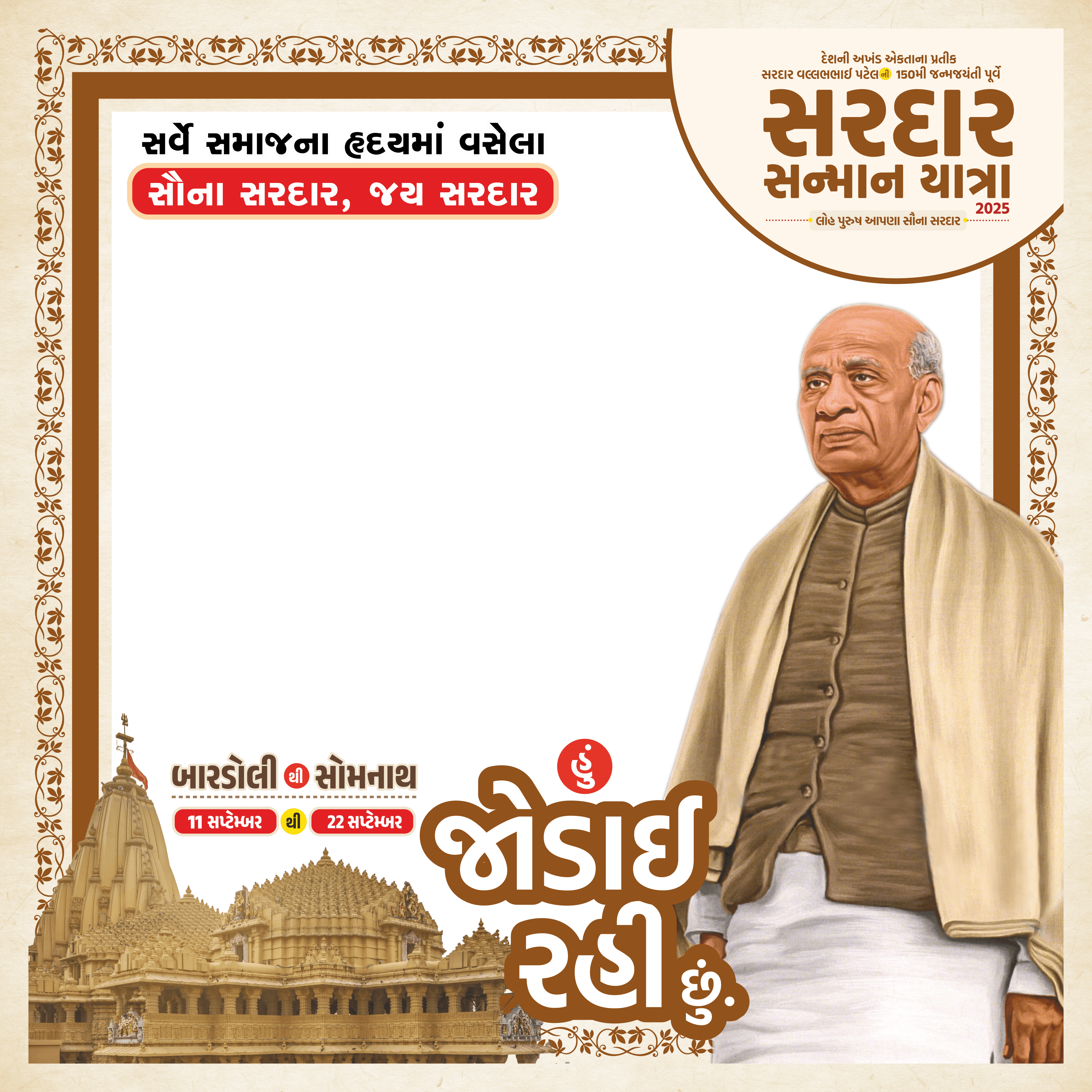 અખંડ ભારતના શિલ્પી, લોખંડી પુરુષ અને રાષ્ટ્રીય એકતાના અવિસ્મરણીય યોદ્ધા સરદાર વલ્લભભાઈ પટેલ ની 150મી જન્મજયંતિ પૂર્વે અમારા દ્વારા “સરદાર સન્માન યાત્રા” નું ભવ્ય આયોજન કરવામાં આવી રહ્યું છે. આ યાત્રા 11 સપ્ટેમ્બર થી 22 સપ્ટેમ્બર, બારડોલી થી પવિત્ર સોમનાથ ધામ સુધી, 12 દિવસની રહેશે, જે કુલ 1800 કી.મી. નું અંતર કાપી 355 ગામોમાં જવાની છે.